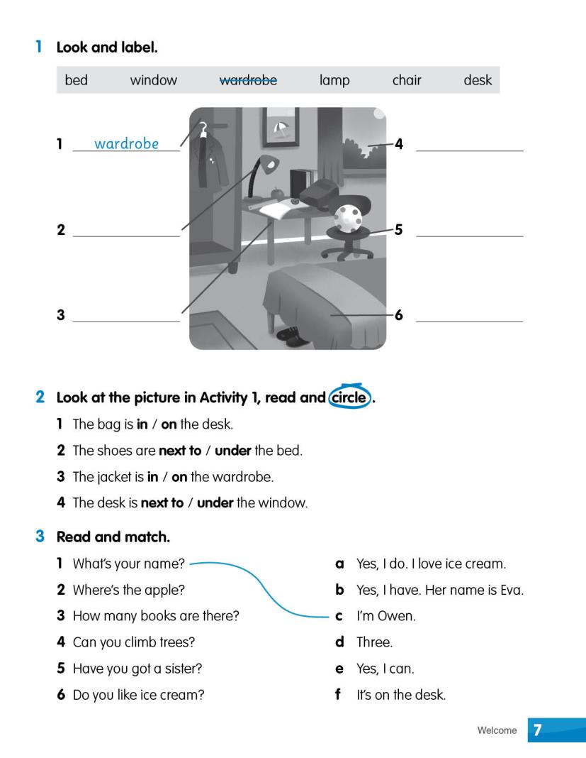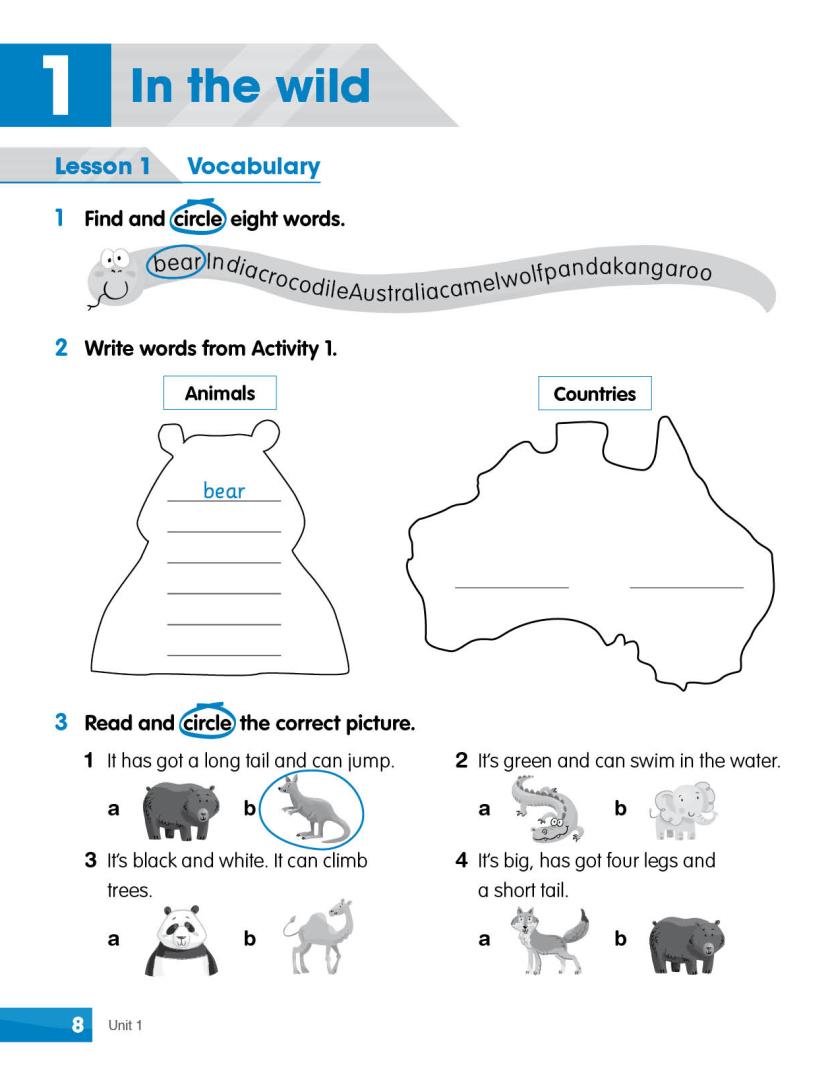 Các chủ đề trong workbook đa dạng, bao gồm gia đình, trường học, bạn bè, động vật, môi trường sống và các hoạt động hàng ngày. Mỗi bài tập đều được thiết kế để vừa củng cố kiến thức vừa nâng cao khả năng tư duy, giúp học sinh không chỉ ghi nhớ từ vựng mà còn biết cách sử dụng chúng trong ngữ cảnh phù hợp. Một điểm nổi bật khác là cách workbook tích hợp kỹ năng nghe và viết. Học sinh không chỉ luyện tập đọc hiểu mà còn phải nghe và điền thông tin, viết câu hoặc đoạn văn dựa trên nội dung nghe. Điều này tạo nên sự kết nối giữa các kỹ năng, đồng thời phát triển phản xạ ngôn ngữ tự nhiên.