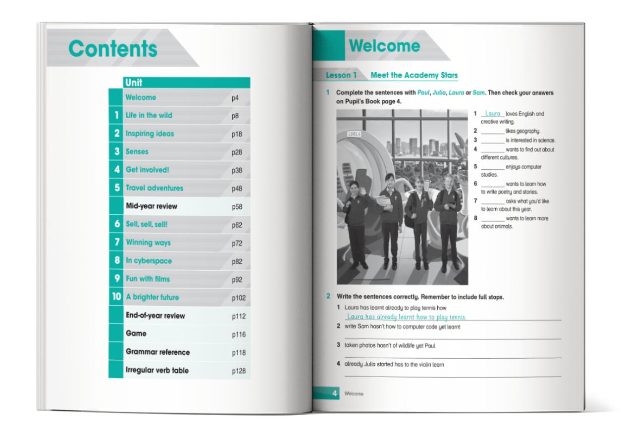 Nội dung trong Sách Academy Stars Workbook 6 được xây dựng chặt chẽ, đồng bộ với Pupil’s Book 6, nhằm đảm bảo học sinh có thể ôn luyện và nâng cao kiến thức một cách hiệu quả. Workbook tập trung vào việc mở rộng từ vựng nâng cao, các cấu trúc ngữ pháp phức tạp và kỹ năng viết luận, chuẩn bị cho học sinh bước vào các kỳ thi tiếng Anh quốc tế hoặc các cấp học cao hơn.