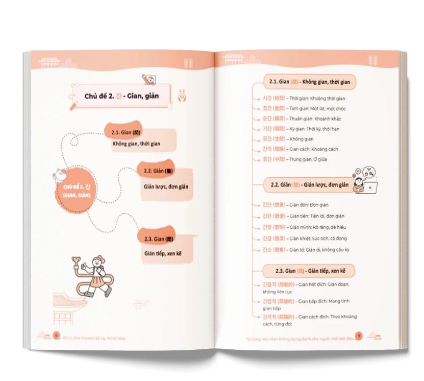 Khi mở cuốn All In One Korean, ấn tượng đầu tiên là sự rõ ràng, sáng tạo và trực quan trong cách trình bày. Toàn bộ từ vựng được chia theo nhóm chủ đề và gốc Hán. Mỗi trang là một mind map nhỏ, ở trung tâm là một chữ Hán Hàn gốc, từ đó tỏa ra các nhánh liên kết với những từ vựng có chung thành phần hoặc ý nghĩa liên quan.