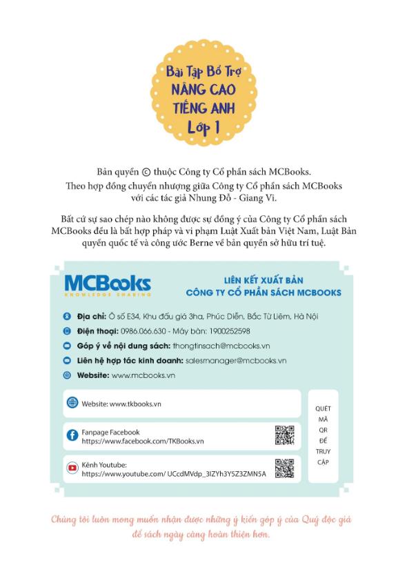 Sách Bài Tập Bổ Trợ Nâng Cao Tiếng Anh Lớp 1 phù hợp cho học sinh lớp 1 đang xây dựng nền tảng tiếng Anh ban đầu, giúp rèn luyện kỹ năng từ vựng, ngữ pháp và phản xạ ngôn ngữ qua bài tập sinh động. Phụ huynh có thể sử dụng sách để đồng hành cùng con học tại nhà, trong khi giáo viên và trung tâm ngoại ngữ dùng làm tài liệu hỗ trợ giảng dạy. Ngoài ra, sinh viên sư phạm tiếng Anh cũng có thể tham khảo sách để nghiên cứu phương pháp giảng dạy cho học sinh tiểu học.