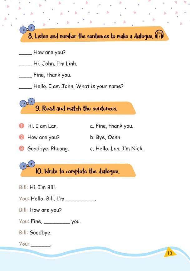 Các dạng bài tập trong sách vô cùng đa dạng: điền từ vào chỗ trống, nối câu, chọn đáp án đúng, sắp xếp từ thành câu hoàn chỉnh, và đặc biệt là các bài luyện nghe và đọc hiểu mang tính ứng dụng cao. Mỗi bài đều được trình bày sinh động, có hình ảnh minh họa trực quan, màu sắc tươi sáng giúp học sinh cảm thấy hứng thú khi học. Ngoài ra, một số bài tập còn khuyến khích các em vận dụng sáng tạo ngôn ngữ qua hoạt động “Write about yourself” (Viết về bản thân) hoặc “Talk with your partner” (Trao đổi với bạn học), tạo nền tảng cho việc giao tiếp bằng tiếng Anh ngay từ sớm.