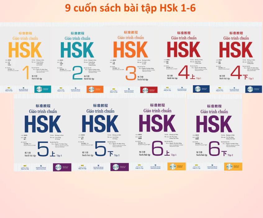 Sách Bài Tập Giáo Trình Chuẩn HSK (汉语水平考试标准教程 练习册) là tài liệu đi kèm chính thức của Giáo Trình Chuẩn HSK 1–6, do Hanban – Viện Khổng Tử Trung ương biên soạn. Bộ sách gồm 9 cuốn tương ứng với 6 cấp độ, trong đó HSK 4, 5 và 6 được chia thành hai tập để đảm bảo khối lượng bài tập phong phú và phù hợp với từng giai đoạn học.