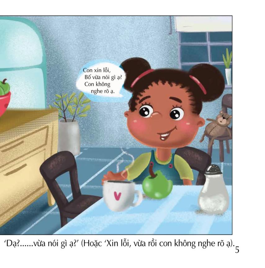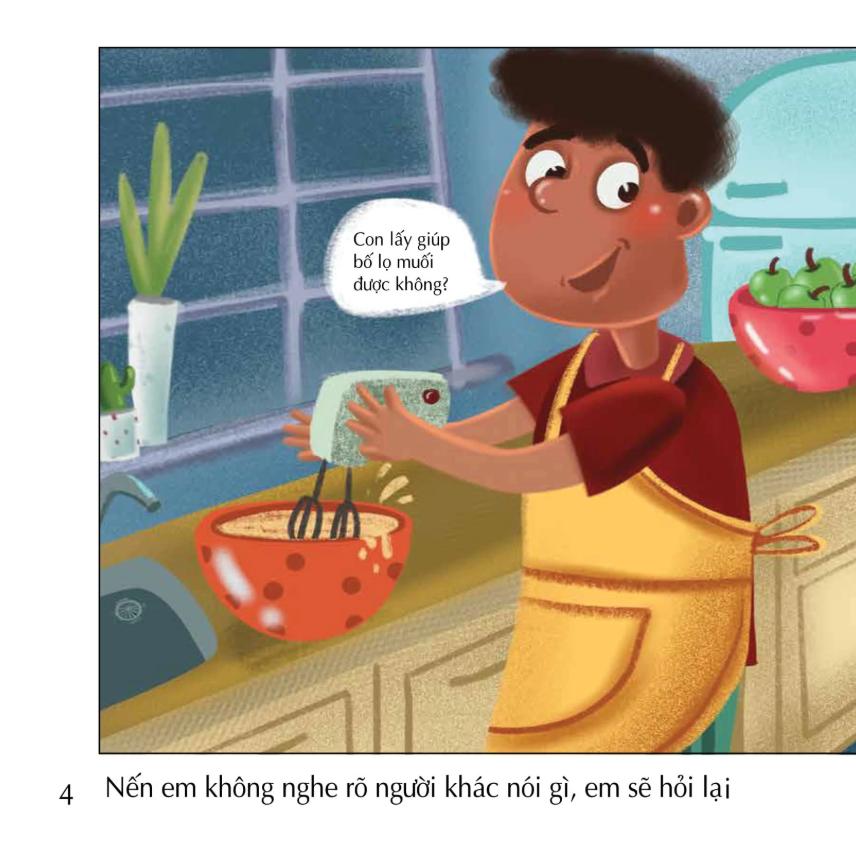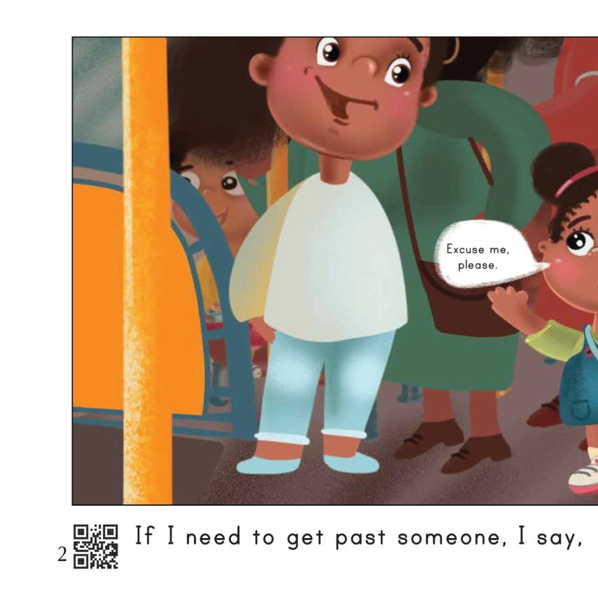 Cuốn sách tập trung vào các tình huống giao tiếp cơ bản nhưng quan trọng, giúp trẻ hiểu và sử dụng câu “Excuse me” trong nhiều bối cảnh. Phần đầu giới thiệu cách sử dụng câu xin phép khi muốn đi qua ai đó, lấy đồ vật, hoặc thu hút sự chú ý một cách lịch sự. Những hình minh họa trực quan kết hợp với các ví dụ đơn giản giúp trẻ dễ dàng hình dung và ghi nhớ cách dùng câu.