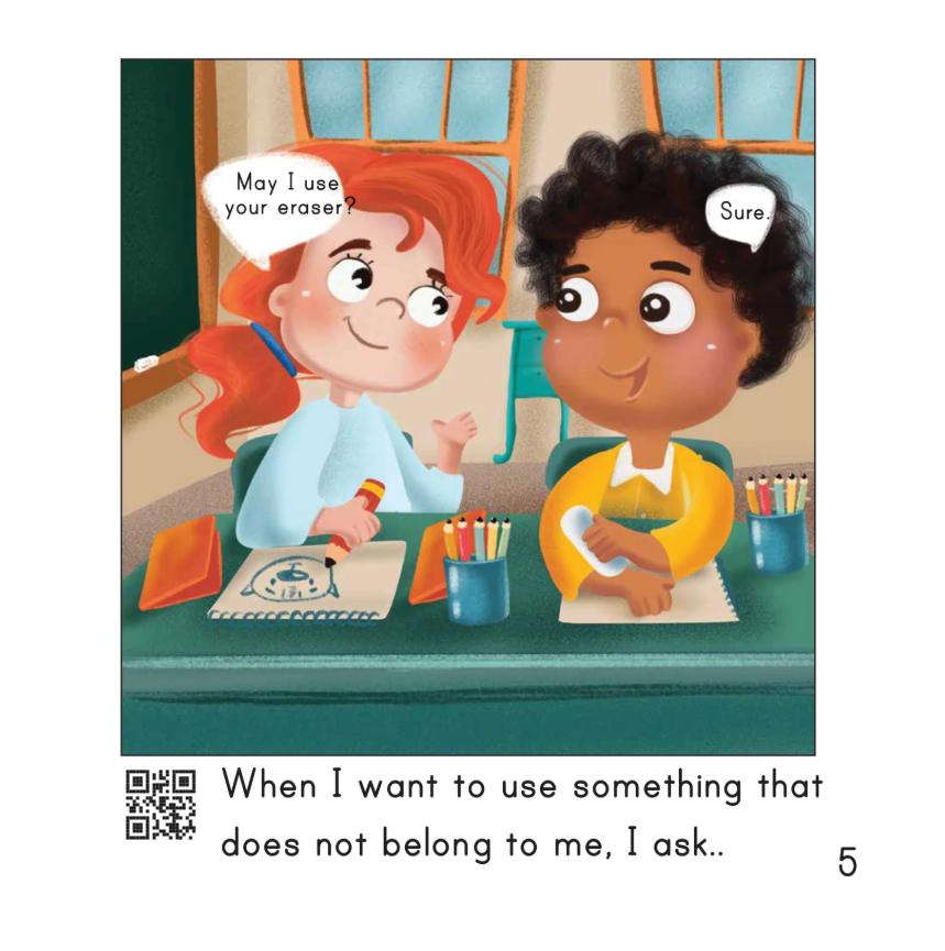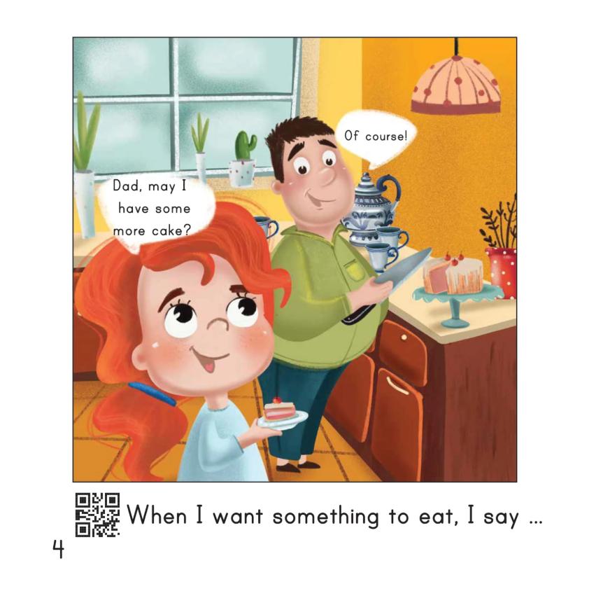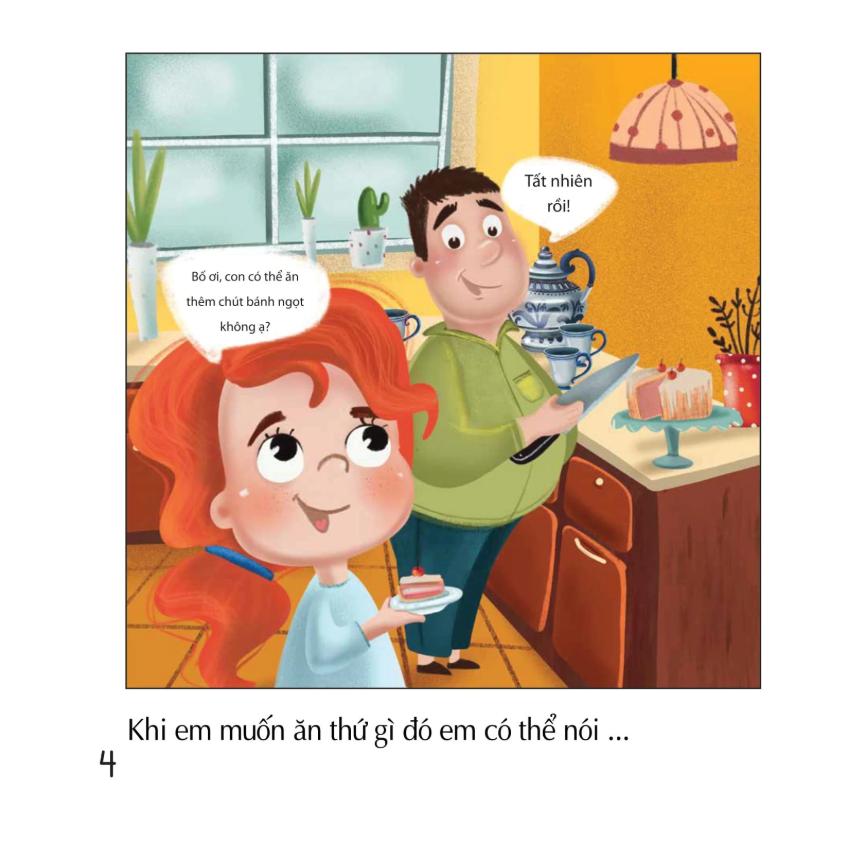 Điểm đáng giá của cuốn sách nằm ở cách tác giả lồng ghép yếu tố ngôn ngữ với kỹ năng xã hội. Trẻ không chỉ học cách đặt câu “May I…?” về mặt cấu trúc, mà còn hiểu được khi nào cần xin phép, thái độ cần thể hiện khi xin phép và phản ứng phù hợp khi được hoặc không được đồng ý. Điều này giúp việc học tiếng Anh vượt ra khỏi phạm vi ngôn ngữ, trở thành một phần của giáo dục hành vi.