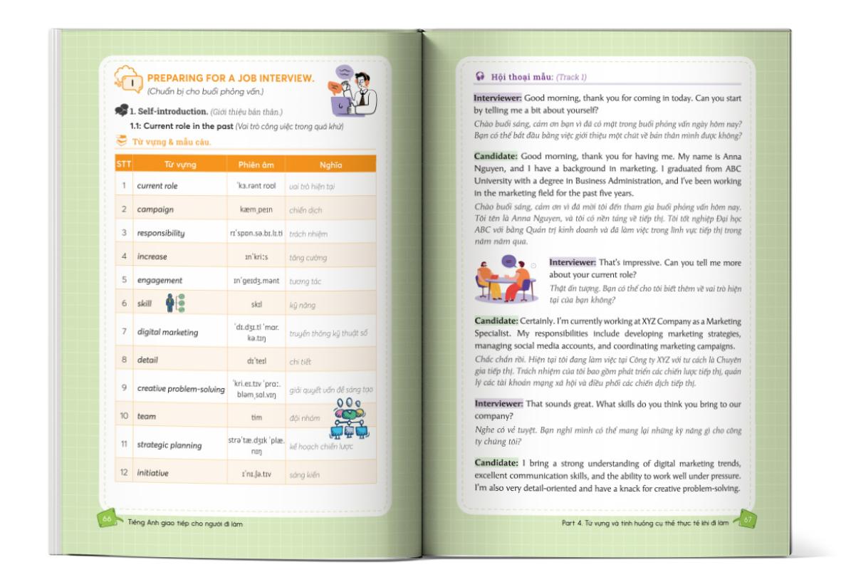 Sách nổi bật nhờ phương pháp học tập ứng dụng trực tiếp vào công việc, không chỉ dừng lại ở việc học thuộc câu mà còn giúp người học linh hoạt vận dụng trong nhiều bối cảnh khác nhau. Các bài hội thoại được biên soạn sát với thực tế văn phòng và môi trường làm việc quốc tế, từ các cuộc họp ngắn đến thảo luận nhóm hay phỏng vấn.
