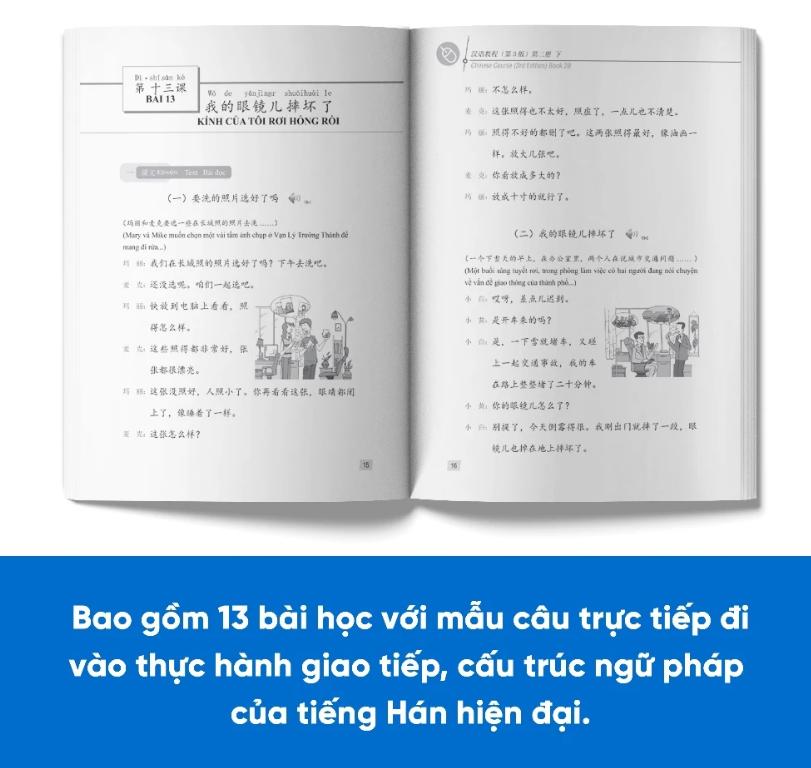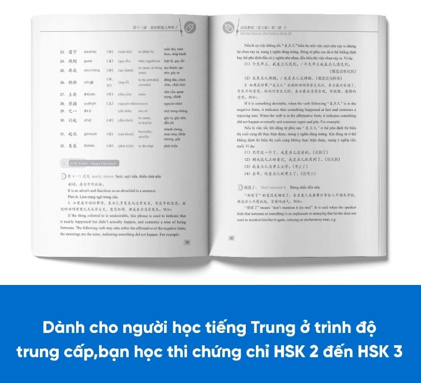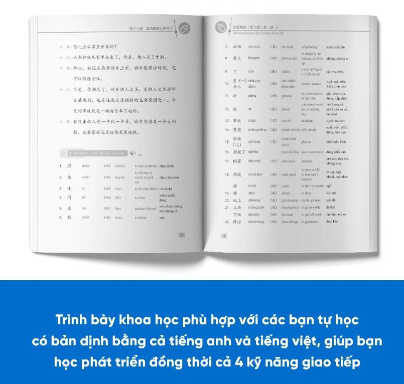 Ngoài ra, file audio đi kèm (giọng đọc chuẩn Bắc Kinh) giúp người học luyện phát âm, ngữ điệu và kỹ năng nghe hiểu một cách chính xác. Hình minh họa và bố cục trong sách cũng được cải tiến hiện đại, rõ ràng, giúp người học dễ theo dõi và giảm cảm giác khô khan khi học các cấu trúc phức tạp.