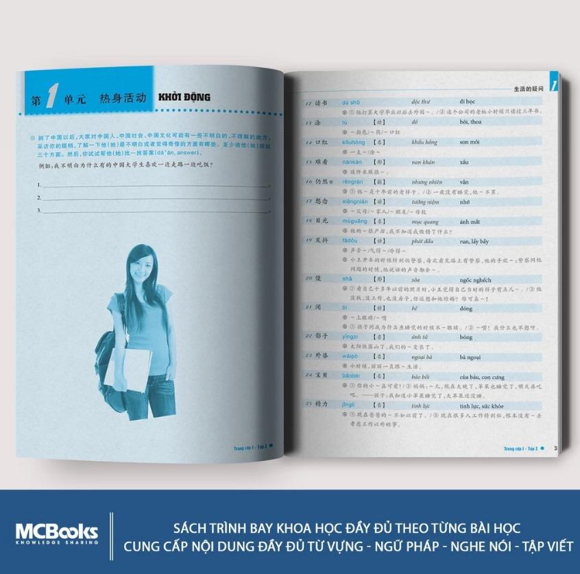 Bộ Trung Cấp I – Tập 2 gồm nhiều bài học, mỗi bài tập trung vào một chủ đề cụ thể, từ giao tiếp đời sống đến giao tiếp học thuật. Mỗi bài bắt đầu bằng hội thoại mẫu, phân tích từng câu, giải thích từ vựng, điểm ngữ pháp và hướng dẫn cách sử dụng trong thực tế.
