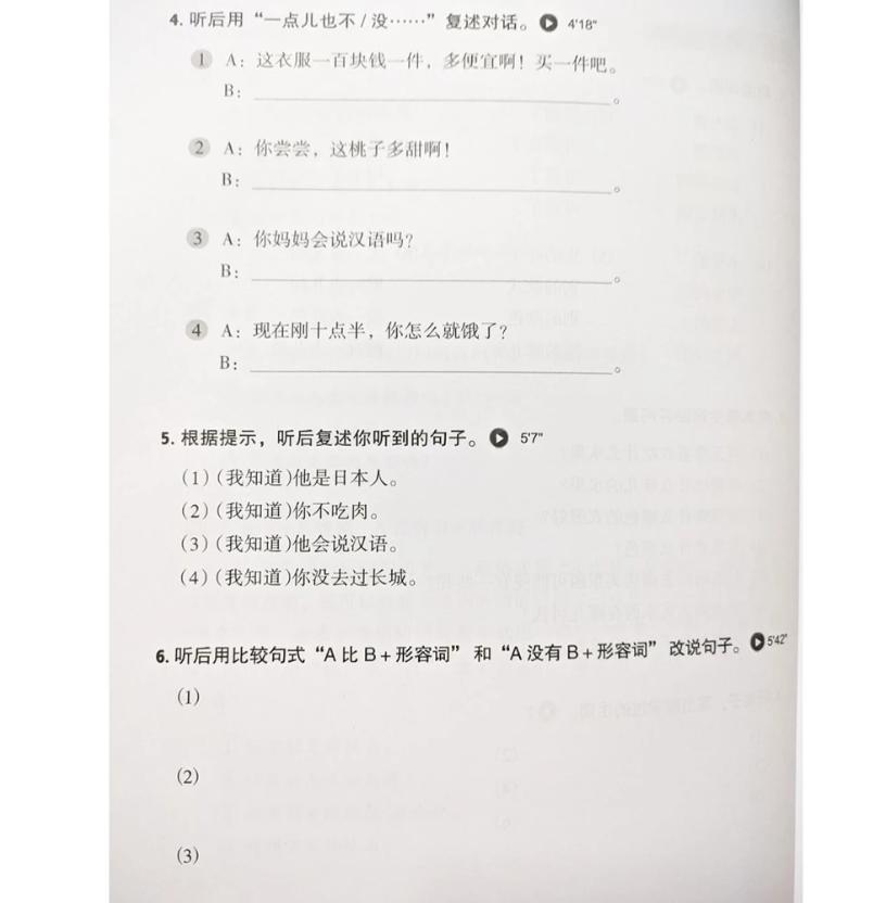 Phần 3 – Bài tập luyện nghe: Phần này giúp người học củng cố kỹ năng nghe chi tiết và nghe khái quát. Có nhiều dạng bài như: nghe chọn đáp án đúng, nghe và điền từ, nghe sắp xếp câu theo thứ tự, hoặc nghe và trả lời câu hỏi ngắn. Các dạng bài đa dạng giúp học viên phát triển khả năng phản ứng nhanh khi nghe tiếng Trung.