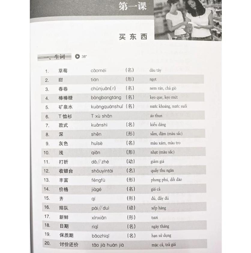 Phần 1 – Từ vựng mới: Trước khi nghe, học viên sẽ được làm quen với những từ khóa quan trọng xuất hiện trong bài. Từ vựng được chọn lọc kỹ, tập trung vào những chủ đề thiết yếu như: chào hỏi, giới thiệu bản thân, hỏi đường, gọi món, mua sắm, đi học, thời tiết, phương tiện giao thông… Mỗi từ đi kèm phiên âm Pinyin và nghĩa tiếng Việt, giúp người học dễ ghi nhớ.